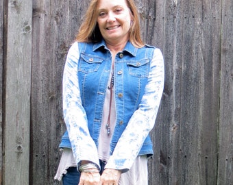 Gray Floral Sleeved Lace Backed Distressed Denim Jacket
