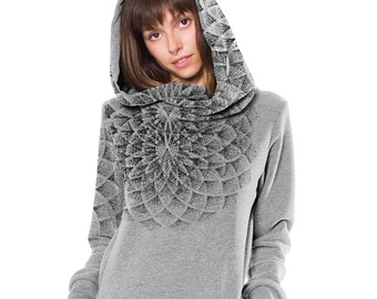 Women's Hoodie Dress Lotus Flower Pointillism Dots Light Gray Pullover - Tunic Hooded Sweatshirt - Street Urban Alternative Clothing