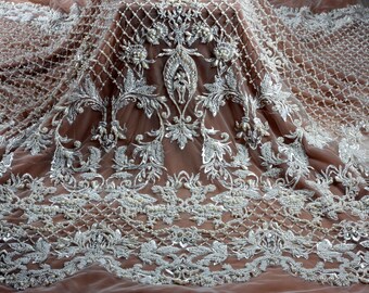 La Belleza Ivory/Gray crystl pearls beading gown lace fabric by yard