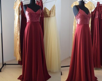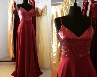 Made To Order Charming Chiffon With Top Sequin Burgundy Bridesmaid Dress, Wedding Party Reception Dress, Sequin Burgundy Prom Dress