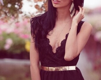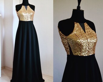 Handmade Black Chiffon With Top Gold Sequin Bridesmaid Dress, sleeveless Full Length Evening Prom Dress, Wedding Dress Custom Made Size