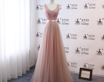 Bridesmaid Dress Beige Tulle Dress,Wedding Dress,V Neck A-Line Prom Dress,Illusion Lace V Back Evening Dress,Sleeveless Maxi Dress(LS150)