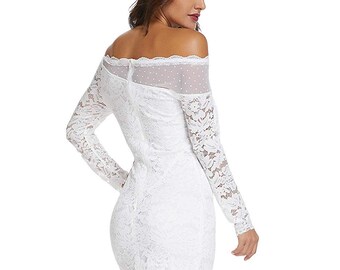 Womens Off Shoulder White Lace Bridesmaid Dress