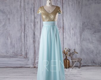 Party Dress Gold Sequin Bridesmaid Dress,Wedding Dress,V Neck Maxi Dress,Cap Sleeve Prom Dress,Mint Blue A-line Chiffon Formal Dress(TQ163)