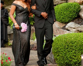 Black Sequin Dress, Black Bridesmaid Dress - Off Shoulder Trumpet Dress