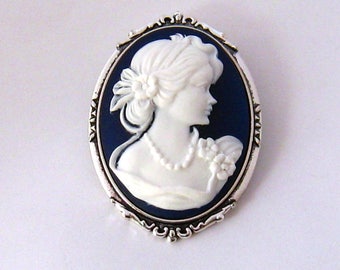 Victorian Woman Dark Blue Cameo Brooch Pendant, Gift for Her, Jewelry