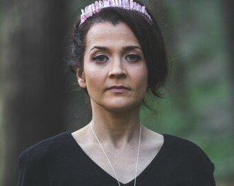 Pink aura quartz crystal tiara, cosplay headpiece, princess bride, boho bridal headpiece, moon goddess crown, raw crystal hair
