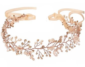 Rose Gold crystal and pearl hair vine, large bridal rose gold hairvine, rose gold crystal pearl hair vine, rose gold headpiece,rosegold vine