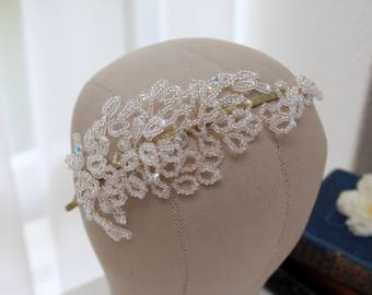 Handcrafted Beaded Lace Tiara, available in White, Ivory or Cream Lace and Beads with gold or silver wire.
