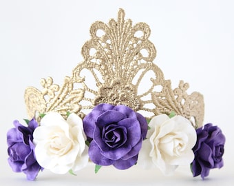 Princess Gold Crown Tiara with Purple + White Flowers - Alice - Princess Tiara - Adult - Toddler - Baby - Photo Prop - Gold Medallion
