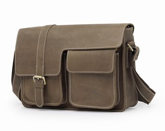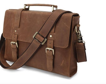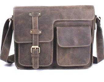 Men's genuine distressed dark brown leather messenger bag
