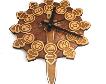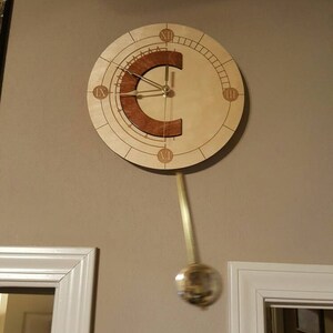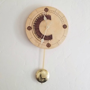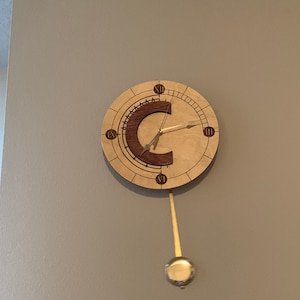 This beautiful laser engraved clock is 11.5in wide, and is hand stained and finished. The clock hands are brass and the movement is Quarts battery powered, while the pendulum is a separate mechanism that requires its own battery. (Total of 2 AA batteries needed; not included).