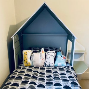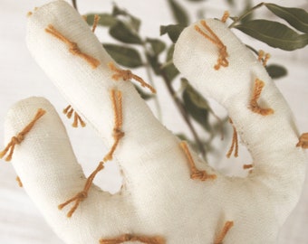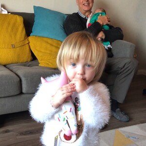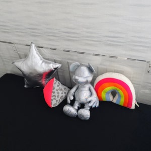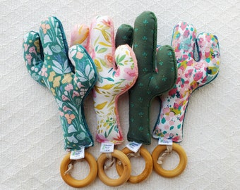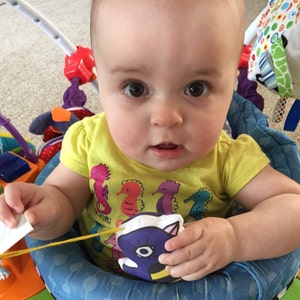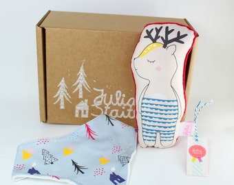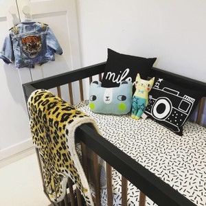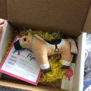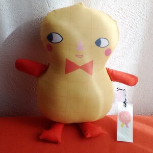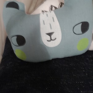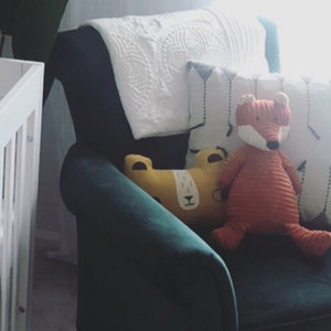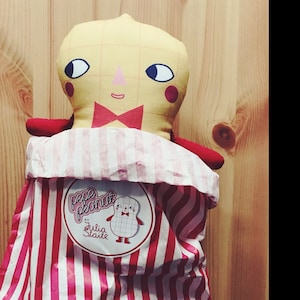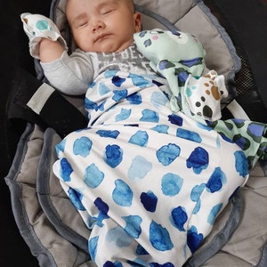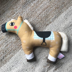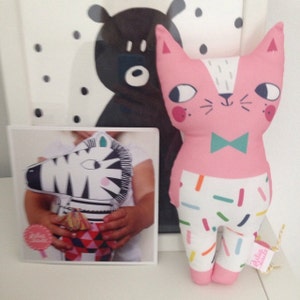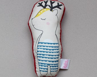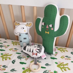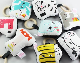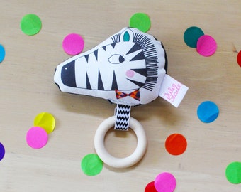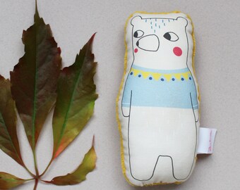 Made from 100% cotton this fun rattle is digitally printed on the front and backed with hand printed blue dots. Filled with non-toxic polyester toy stuffing.