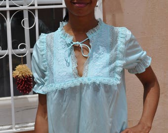 Vintage 1980s Paramount New York Turquoise Sleep Shirt with Ruffles and Embroidery