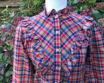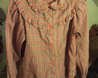 Vintage Handmade Green and Red Plaid Long Sleeve Button Up Blouse Shirt With Ruffles Women's Size Small