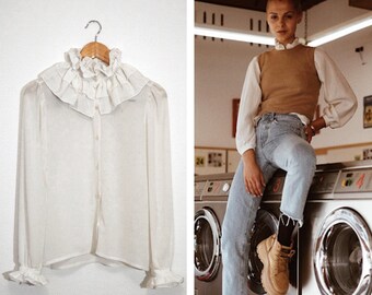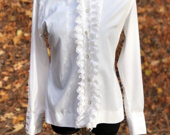 VINTAGE 80s Ruffle Collar and Sleeve Blouse | White Button-Down Shirt | Ruffles | Size M