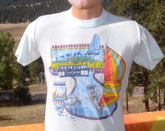 vintage 80s t-shirt MANZANILLO rainbow sail boat tee Medium Small mexico travel soft thin
