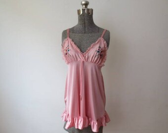 Vintage '70s JCPenney Pink Embroidered Boho Babydoll Tank, Shimmery Nylon w/ Ruffles & Lace, Medium
