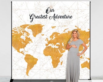 Travel and Adventure Party Decor, Travel Themed Baby Shower Backdrop, Our greatest adventure, Faux Gold Glitter map, Any color BBS0064