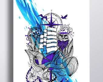 Ship in storm Print, boat decor, sailor decor, sail ship fighting to storm,Stormy Seas Original Print, Ship wall art Ship wall decor Sea art
