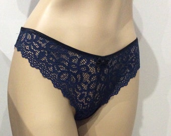 Slip sexy, culotte, shorty en dentelle extensible bleu marine