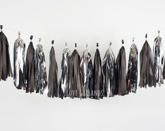 Black Silver Tassel Garland, Black Silver Garland, Black Silver Bunting, Black Silver Banner, Black Silver Party Decor, Black Silver Wedding