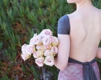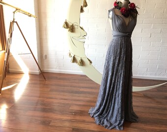 Two- Toned Satin and Lace Octopus Infinity Wrap Dress- Mulberry Lace with Glacier Dark Grey ~ Wedding Gown, Bridesmaids, Maternity, Etc.