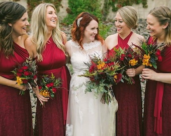 Embroidered Burgundy Lace with Bellport Crimson Satin- Vintage Style Octopus Infinity Wrap Dress- Wedding Gown, Bridesmaids, Maternity, Etc.