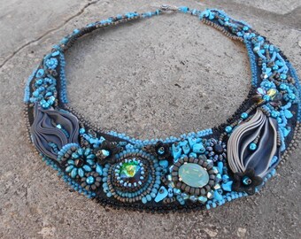 Necklace embroidered beads and silk shibori "blue dream of a summer night"