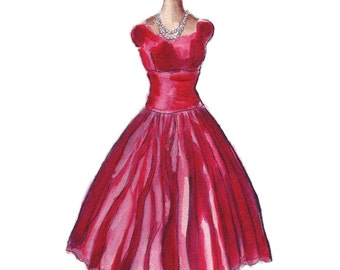 Fashion Illustration Watercolor Painting - Vintage Red Dress Fashion Watercolor Art Print, 5x7