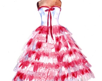 5x7 Fashion Watercolor Painting - Red and White Tiered Strapless Vintage Party Dress - 5x7 Print