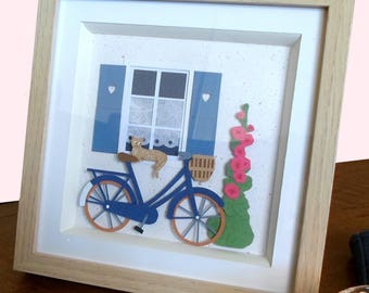 Picture in paper cut and pasted "Blue bicycle" * handmade *.