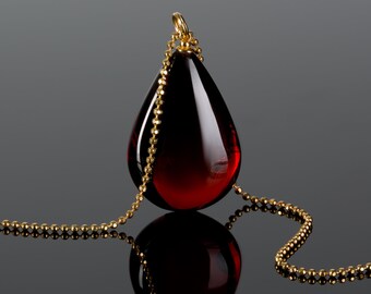 Deep red amber teardrop pendant with gold vermeil bead chain, luxury necklace for women, unique gift for her, dark red and gold jewelry