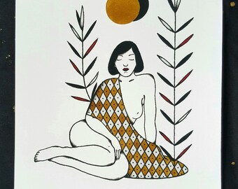 Original etching "woman with big hair and ape"