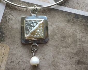 Handmade Pendant on Neckwire Necklace Pearls Grey Swarovski Crystals Pearl Drop Square Silvertoned Metal Resin