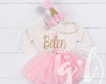 First Birthday Outfit, First Birthday Dress, Pink and gold birthday, 1st birthday outfit, 1st birthday dress, polka dot, long sleeve