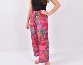 Pink floral cotton lounge pants / pyjamas with elastic waistband and drawstring - Oriental Garden Pink
