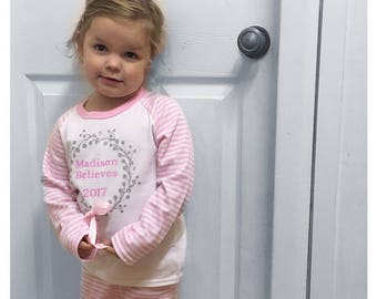 I Believe - Pink Pyjamas with silver glitter wreath and bow. Perfect for Christmas and Christmas Eve