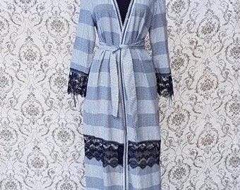 Unique check print long robe decorated with lace. Loungewear. Lingerie. Unique loungewear. Lounge robe. Sleepwear.