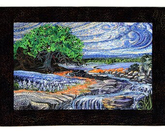 Art Quilt Wall Decor - Vincent van Gogh Style Wall Hanging Landscape Waterfall Cottage Decor Quilted Office Decor Blue Green Mixed Media