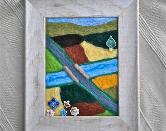 Country scenery art - Needle felted landscape with ceramic buttons in frame - River and fields art - Mixed media scenery - Textile wall art