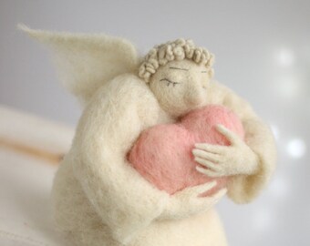 Needle Felted Angel - Dreamy Angel With A Pink Heart - Valentine Gift Idea - Cupid Angel - Guardian Angel - Blush Pink - Wool - Home Decor