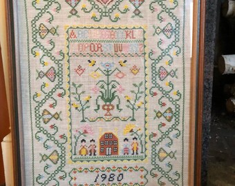 Vintage hand stitched ABC People Yellow Birds Canaries Flowers Hearts Home Folk Art Americana Cross Stitch Embroidery framed sampler