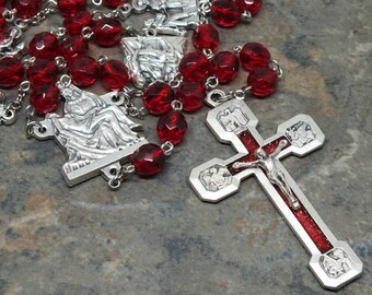 Stations of the Cross Chaplet in Ruby Czech Glass, Catholic Chaplet, July Birthstone Chaplet, Chaplet With Color Crucifix and Pieta Center