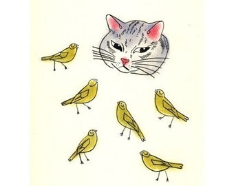 Cat Art - The Cat and the Canaries 4 for 3 SALE - 8.3" X 11.7" print