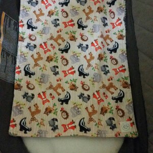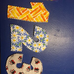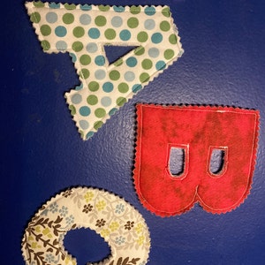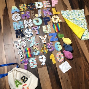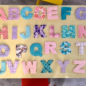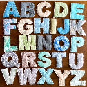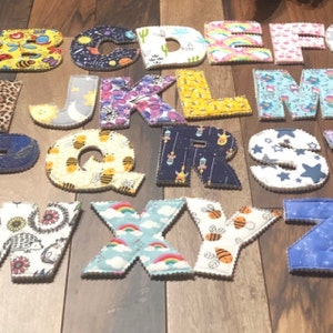 Bright colored alphabet letters with solid color flannel backing so child will know the correct side of the letter is the print side. Each letter has a double layer of cotton batting in the middle.