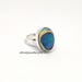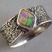 This beautiful boulder opal is placed in the center of a patchwork band. Size 11