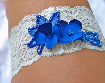 ivory and royal blue garter;ivory lace bridal garter;royal blue and lace garter