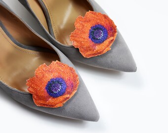 Orange poppy - shoe clips, shoe accessories, shoe fashion, real glitter, leather accessories, wedding shoe