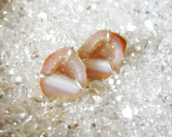 Pink & White Geode Earrings, TINY Rough Peach Crystal Earrings, Peach Pink Wedding, Jewelry Under 100, Sister, Gemologies, Worldwide Seller